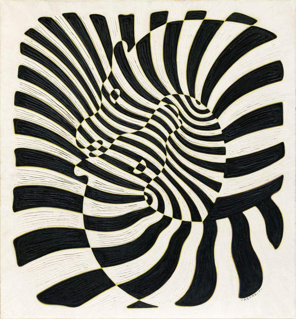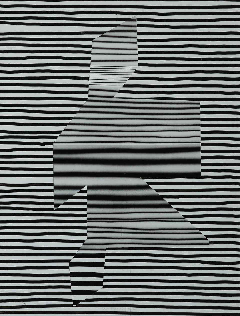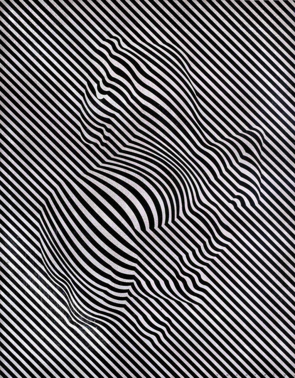 Flickering lines everywhere! Does the eye follow the horizontal lines or remain fixed on the figure? Taking collages of differently lined photo paper as his point of departure, Vasarely embarked on investigations based on the positive-negative principle of photography.