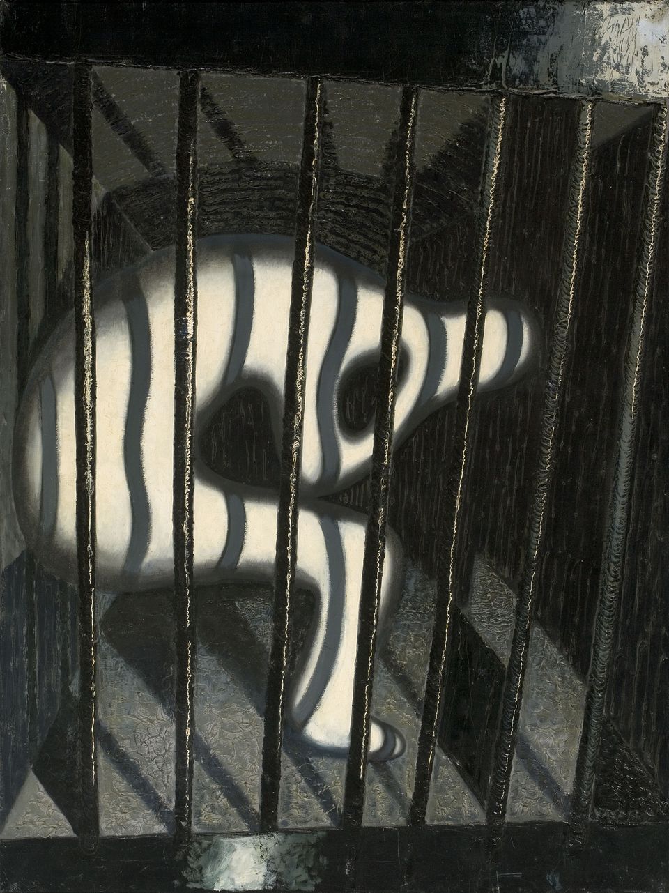 A prisoner is pictured sitting behind the bars of his cell. Like his contemporaries, the Cubists, Futurists and Surrealists, Vasarely experimented with figural depiction. Yet the painting’s structures and patterns are far more conspicuous than the actual pictorial motif. The texture created by the dark bars and the shadows they cast on the white body takes on a life of its own.
