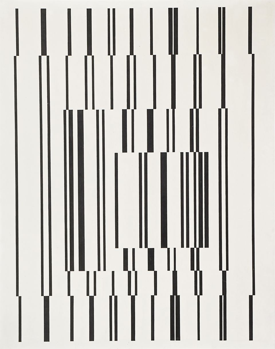 The viewer will wait in vain for the black lines in “Fugue” to lock into a neat row of congruent verticals. The rhythmically placed lines of varying width flicker before the white background. At the same time, the eye completes the contours suggested by the interrupted lines. An image of nested squares appears.